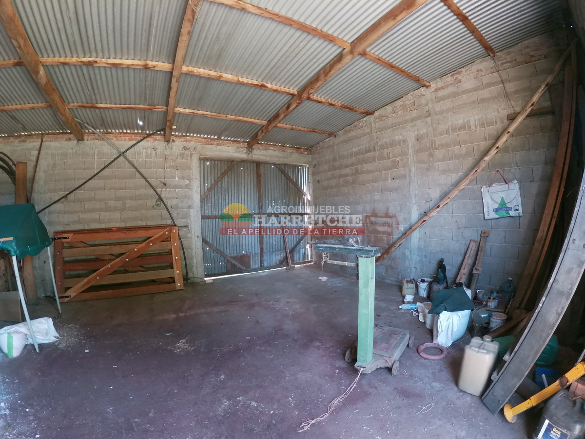 Amplio galpón (ex tambo) paredes revocadas en su mayoría, techos en dolmenit con tirantería en puntales de madera, pisos en hormigón, cuenta con 3 portones corredizos que comunican a las mangas, y a los otros galpones.